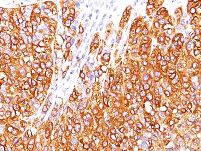 Formalin-fixed, paraffin-embedded human Melanoma stained with MART-1 Monoclonal Antibody (M2-7C10).