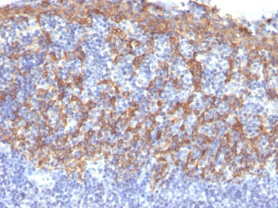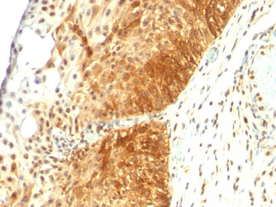 Cytokeratin 14 (CK14) belongs to the type I (or A or acidic) subfamily of low molecular weight keratins and exists in combination with keratin 5 (type II or B or basic). CK14 is found in basal cells of squamous epithelia, some glandular epithelia, myoepithelium, and mesothelial cells. Anti-CK14 is useful in differentiating squamous cell carcinomas from poorly differentiated epithelial tumors. Anti-CK14 is one of the specific basal markers for distinguishing between basal and non-basal subtypes of breast carcinomas. Anti-CK14 is also a good marker for differentiation of intraductal from invasive salivary duct carcinoma by the positive staining of basal cells surrounding the in-situ neoplasm as well as for differentiation of benign prostate from prostate carcinoma. Furthermore, this antibody has been useful in separating oncocytic tumors of the kidney from its renal mimics, and in identifying metaplastic carcinomas of the breast.
