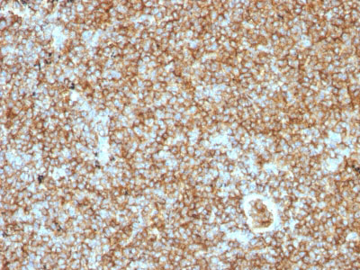 CD45R, also designated CD45 and PTPRC, has been identified as a transmembrane glycoprotein, broadly expressed among hematopoietic cells. Multiple isoforms of CD45R are distributed throughout the immune system according to cell type. These isoforms arise because of alternative splicing of exons 4, 5, and 6. The corresponding protein domains are characterized by the binding of monoclonal antibodies specific for CD45RA (exon 4), CD45RB (exon 5), CD45RC (exon 6) and CD45RO (exons 4 to 6 spliced out). The variation in these isoforms is localized to the extracellular domain of CD45R, while the intracellular domain is conserved. CD45RB is expressed on mature B-lymphocytes and the majority of lymphomas and leukemias of B-cell origin.