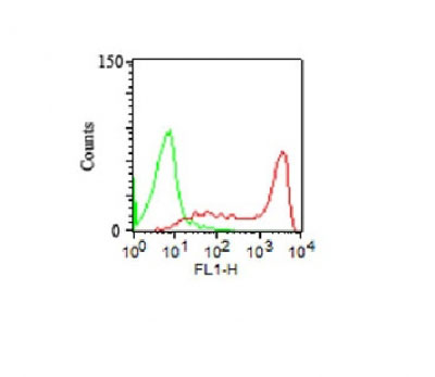FACS Analysis human of PBMC using CD45RA Monoclonal Antibody (158-4D3) (red) and isotype control (green). |