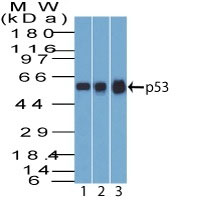 Western Blot of p53 1) A431; 2) MCF7; 3) HEK293 Lysate probed with p53 Monoclonal Antibody (BP53-12). |