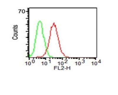 Flow Cytometry of KG-1 cells using CD34 Monoclonal Antibody (HPCA1/1171) (red) & isotype control (green). |