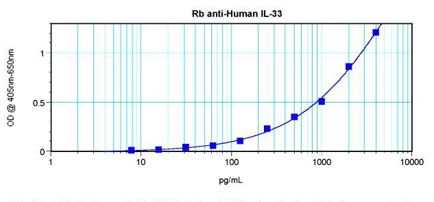 To detect hIL-33 by sandwich ELISA (using 100 μl/well antibody solution) a concentration of 0.5 - 2.0 μg/ml of this antibody is required. This antibody allows the detection of at least 0.2 - 0.4 ng/well of recombinant hIL-33. |