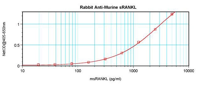 To detect msRANKL by sandwich ELISA (using 100 μl/well antibody solution) a concentration of 0.5 - 2.0 μg/ml of this antibody is required. This antibody allows the detection of at least 0.2 - 0.4 ng/well of recombinant msRANKL. |