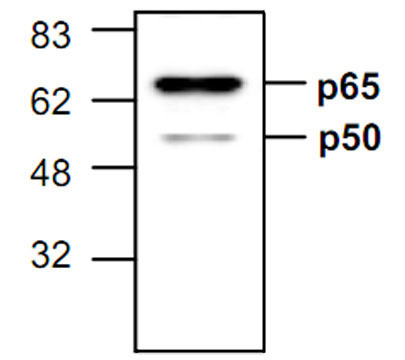 NFkB is a heterodimer that consists of a 50 kDa DNA binding subunit (p50) and a 65 kDa transactivation subunit (p65/RelA). Both of these subunits exhibit sequence homology to the protooncogene c-Rel. The p50 has an isoform called p49/p52, and both proteins are derived from the amino-terminal of precursor protein p105 and p100. The p50/p65 heterodimer remains in the cytosol in an inactive form as a complex with its inhibitor, IkB. Upon stimulation of cells by a wide variety of stimuli such as lipopolysaccharide (LPS), pro-inflammatory cytokines (IL-1 & TNF, etc.), and viral infection, IkB is phosphorylated and degraded by proteosome. The active NFkB heterodimer is translocated into the nucleus and induces gene expression.