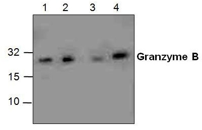Western blot analysis of Granzyme B in lysate from Jurkat cells (Lane1&2), 3T3 cells (Lane 3) and rat kidney (Lane 4). |
