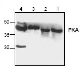 Western blot analysis of PKA expression in lysates from Jurkat cells (Lane 1 & 2), mouse small intestine (Lane 3) and rat kidney (Lane 4) |