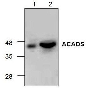 Western blot analysis of ACADSB with mouse 3T3 cell lysate (Lane 1) and rat kidney tissue lysate (Lane 2). |