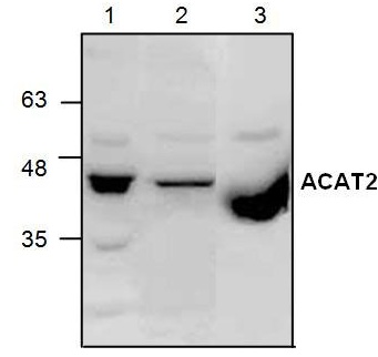 Western blot analysis of ACAT2 using Jurkat cell lysate (Lane 1& 2) and rat kidney tissue lysate Lane 3). |
