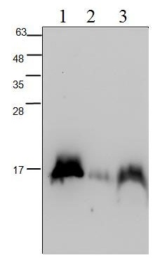 Western blot analysis of Profilin 1 using lysate From Jurkat cells (Lane 1), 3T3 cells (Lane 2) and rat kidney tissue lysate (Lane 3). |