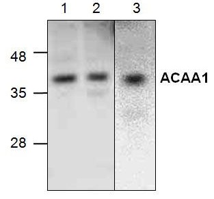 Western blot analysis of ACAA1 using Jurkat cell lysate (Lane 1& 2) and rat kidney tissue lysate (Lane 3). |