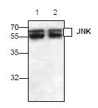 Western blot analysis of JNK expression in Jurkat cell lysates (Lane 1, 2). |