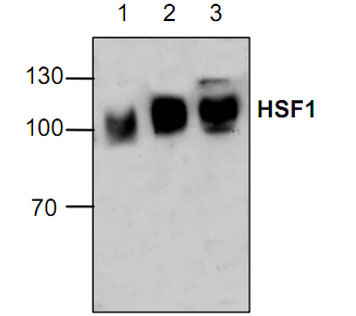 Western blot analysis of HSF-1 expression in lysates from 3T3 cells (Lane 1) and Jurkat cells (Lane 2,3). |