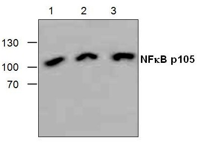 Western blot analysis of NFkB p105 expression in lysate from 3T3 cells (Lane 1) and in Jurkat cells (Lane 2 & 3). |