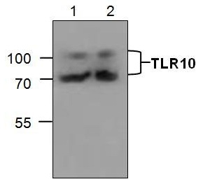 Western blot analysis of TLR10 expression in Jurkat cell lysate (Lane 1& 2). |