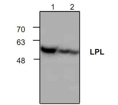 Western blot analysis of LPL with lysate from rat kidney (Lane 1) and 3T3 cells (Lane 2). |