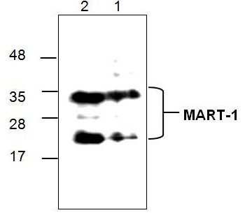 Western blot analysis using recombinant human MART-1. Lane1: 10 ng; Lane 2: 50 ng |