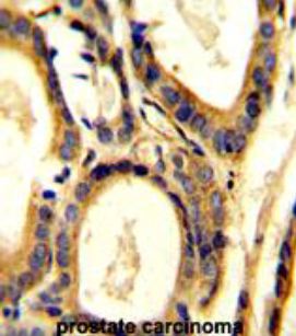 CCL4 Antibody (Center) immunohistochemistry analysis in formalin fixed and paraffin embedded human prostate carcinoma followed by peroxidase conjugation of the secondary antibody and DAB staining. This data demonstrates the use of the CCL4 Antibody (Center) for immunohistochemistry. Clinical relevance has not been evaluated. |