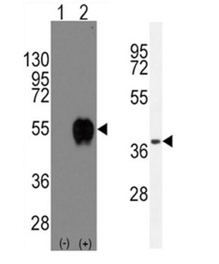 Western blot analysis of CD14 (arrow) using rabbit polyclonal CD14 Antibody (NT). 293 cell lysates (2 μg/lane) either nontransfected (Lane 1) or transiently transfected with the CD14 gene (Lane 2) and A549 cell line lysates (35 μg/lane) used for analysis.