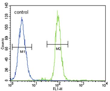 FACS analysis of A549 cells (right histogram) compared to a negative control cell (left histogram).FITC-conjugated goat-anti-rabbit secondary antibodies was used for the analysis.