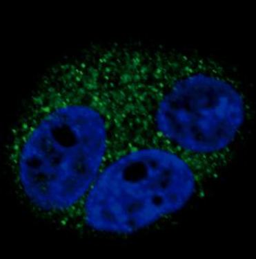 Confocal IF analysis of CD14 Antibody (N-term) with A549 cell followed by Alexa Fluor 488-conjugated goat anti-rabbit lgG (green).DAPI was used to stain the cell nuclear (blue). |