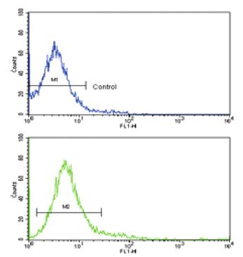 FACS analysis of Jurkat cells using CD45 Antibody (C-term) (bottom histogram) compared to a negative control cell (top histogram). FITC-conjugated goat-anti-rabbit secondary antibodies were used for the analysis. |