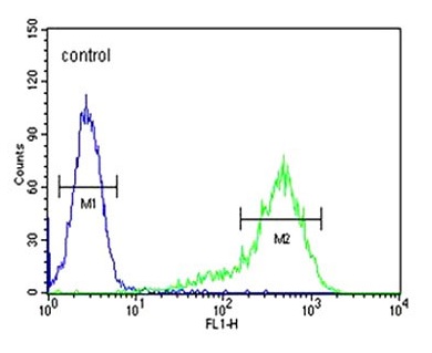 ANGPTL1 Antibody flow cytometric analysis of Hela cells(right histogram)compared to a negative control cell(left histogram). Fitch-conjugated goat-anti-rabbit secondary antibodies were used for the analysis. |