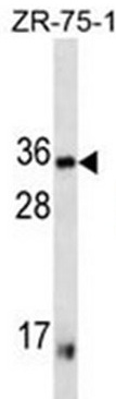 HLA-DRA Antibody western blot analysis in ZR-75-1 cell line lysates (35 μg/lane).This demonstrates the HLA-DRA antibody detected the HLA-DRA protein (arrow). |