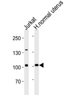 TERT Antibody western blot analysis in Jurkat cell line and human normal uterus tissue lysates (35 μg/lane).This demonstrates the TERT antibody detected the TERT protein (arrow).
