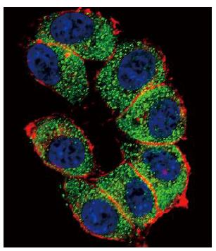 Confocal IF analysis of TERT Antibody with HeLa cell followed by Alexa Fluor 488-conjugated goat anti-rabbit lgG (green). Actin filaments have been labeled with Alexa Fluor 555 phalloidin (red). DAPI was used to stain the cell nuclear (blue).