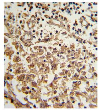 Formalin-fixed and paraffin-embedded human lymph with TERT Antibody which was peroxidase-conjugated to the secondary antibody, followed by DAB staining. This data demonstrates the use of this antibody for immunohistochemistry. |