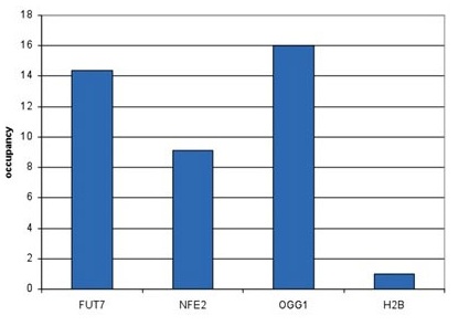 ChIP assays were performed using Kasumi cells and the antibody and optimized PCR primer sets for qPCR. The Fig shows the occupancy, calculated as the ratio + control/background for which the promoter of the H2B gene was used.