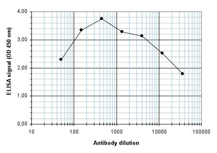 To determine the titer, an ELISA was performed using a serial dilution of the antibody. The antigen used was a peptide containing the histone modification of interest. By plotting the absorbance against the antibody dilution the titer of the antibody was estimated to be 1:32,750. |
