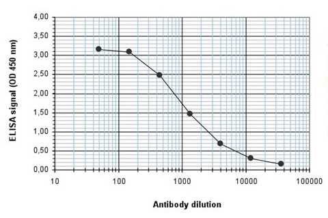 An ELISA was performed using a serial dilution of the antibody. The plates were coated with the peptide used for immunization of the rabbit. By plotting the absorbance against the antibody dilution, the titer of the antibody was estimated to be 1:1300. |
