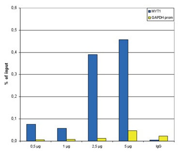 ChIP assays were performed using HeLa cells, the antibody and optimized PCR primer sets for qPCR. A titration of the antibody consisting of 0.5, 1, 2.5 and 5 μg per ChIP experiment was analysed. IgG (2 μg/IP) was used as negative IP control. Quantitative PCR was performed with primers for MYT1, used as a positive control target, and for the promoter of the active GAPDH gene, used as a negative control. Figure 1 shows the recovery, expressed as a % of input (the relative amount of immunoprecipitated DNA compared to input DNA after qPCR analysis).