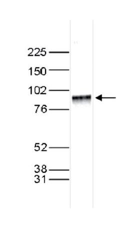 Nuclear extracts of HeLa cells (40 μg) were analysed by Western blot using the antibody diluted 1:1,000 in TBS-Tween containing 5% skimmed milk. The position of the protein of interest (expected size 85 kDa) is indicated on the right; the marker (in kDa) is shown on the left. |