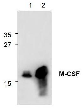 Western blot analysis of M-CSF using recombinant human M-CSF. Lane1: 250ng; Lane2: 1ug. |