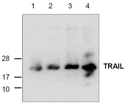 Western blot analysis using recombinant human TRAIL. Lane1: 50ng; Lane2: 100ng; Lane3: 200ng; Lane4: 500ng. |