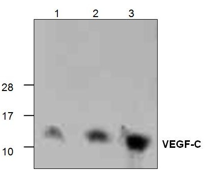 Western blot analysis using recombinant murine VEGF-c. Lane1: 50ng; Lane2: 100ng; Lane3: 200ng. |