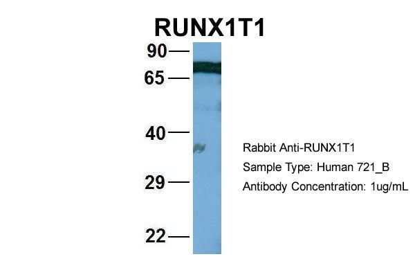 RUNX1T1 antibody - middle region (APR00568G) in Human 721_B cells using Western BlotHost: Rabbit Target Name: WT1 Sample Tissue: 721_B Antibody Dilution: 1.0μg/mlRUNX1T1 is supported by BioGPS gene expression data to be expressed in 721_B