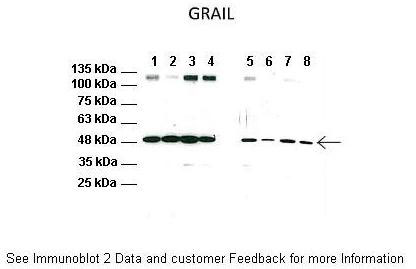 Lanes: 1: CD4 T cell lysate from WT mice, 2: CD4 T cell lysate from WT mice treated with anti-CD3/CD28, 3: CD4 T cell lysate from WT mice treated with FK506, 4: CD4 T cell lysate from WT mice treated with anti-CD3/CD28 and FK506, 5: CD4 T cell lysate from TRPV1 KO mice, 6: CD4 T cell lysate from TRPV1 KO mice treated with anti-CD3/CD28, 7: CD4 T cell lysate from TRPV1 KO mice treated with FK506, 8: CD4 T cell lysate from TRPV1 KO mice treated with anti-CD3/CD28 and FK506. Primary Antibody Dilution: 1:1000 Secondary Antibody: Anti-rabbit HRP Secondary Antibody Dilution: 1:10,000 Gene Name: RNF128 Submitted by: Christine Quinley, UCSD |