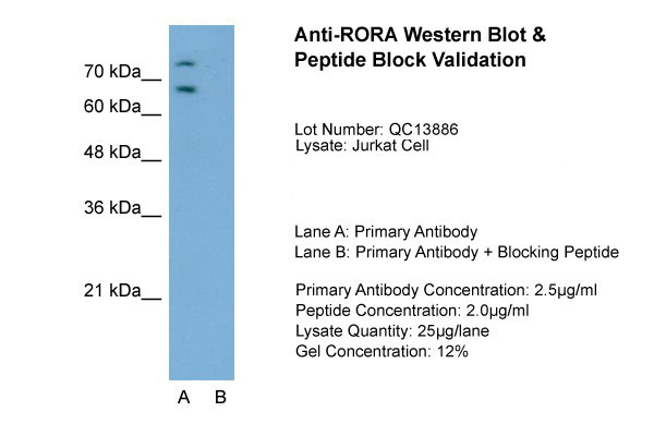 Host: Rabbit Target Name:RORA Sample Tissue:Jurkat Lane A: Primary Antibody Lane B: Primary Antibody + Blocking Peptide Primary Antibody Concentration:2.5μg/ml Peptide Concentration: 2.0μg/ml Lysate Quantity: 25ug/lane Gel Concentration: 12% |