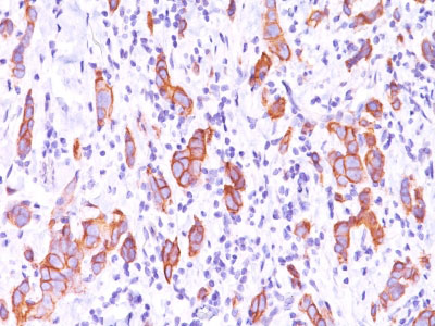 Formalin-fixed, paraffin-embedded human Breast Carcinoma stained with HER-2 Monoclonal Antibody (HRB2/451). |