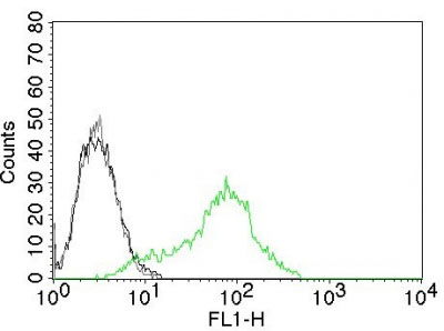 Flow Cytometry of Human Ku (p70/p80) on 293T Cells. Black: Cells alone; Grey: Isotype Control; Green: AF488-labeled Ku Monoclonal Antibody (KU729). |