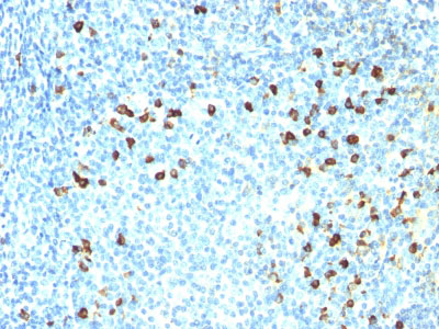 Formalin-fixed, paraffin-embedded human Tonsil stained with Lambda Light Chain Monoclonal Antibody (ICO-106). |