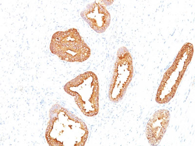 Recognizes a single protein of 33-34kDa, identified as the prostate specific antigen (PSA). This MAb is highly specific to PSA and stains prostatic secretory and ductal epithelium in both normal and neoplastic tissues. PSA is a chymotrypsin-like serine protease (kallikrein family) exclusively produced by the prostate epithelium, and abundant in seminal fluid. PSA can be detected in the sera of patients with prostatic carcinoma. It is predominantly complexed to a liver-derived serine protease inhibitor, alpha-1-antichymotrypsin (ACT). A higher proportion of serum PSA is complexed to ACT in prostate cancer than in benign prostate hyperplasia. This MAb makes an excellent pair with MAb 1A7G6B6 for PSA tests.