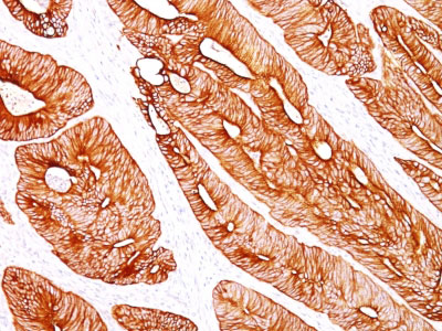 Cytokeratin 8 (CK8) belongs to the type II (or B or basic) subfamily of high molecular weight cytokeratins and exists in combination with cytokeratin 18 (CK18). CK8 is primarily found in the non-squamous epithelia and is present in majority of adenocarcinomas and ductal carcinomas. It is absent in squamous cell carcinomas. Hepatocellular carcinomas are defined by the use of antibodies that recognize only cytokeratin 8 and 18. CK8 exists on several types of normal and neoplastic epithelia, including many ductal and glandular epithelia such as colon, stomach, small intestine, trachea, and esophagus as well as in transitional epithelium. Anti-CK8 does not react with skeletal muscle or nerve cells. Epithelioid sarcoma, chordoma, and adamantinoma show strong positivity corresponding to that of simple epithelia (with antibodies against CK8, CK18 and CK19). Reportedly, anti-CK8 is useful for the differentiation of lobular (?ring-like, perinuclear? ) from ductal (?peripheral-predominant?) carcinoma of the breast.