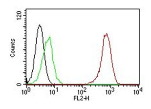 Flow Cytometry of human CD31 on Jurkat Cells.Black: Cells alone; Green: Isotype Control; Red: PE-labeled CD31 Monoclonal Antibody (C31.7).