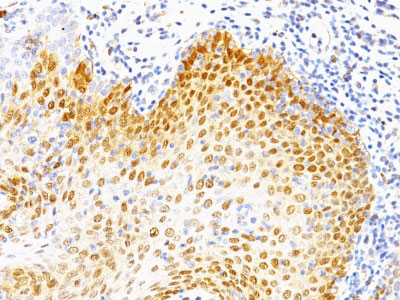 Formalin-fixed, paraffin-embedded human Cervical Carcinoma stained with p53 Monoclonal Antibody (BP53-12 + DO-7) |
