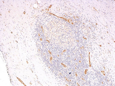 von Willebrand Factor (vWF) is a multimeric glycoprotein that is found in endothelial cells, plasma and platelets. It acts as a carrier protein for Factor VIII and promotes platelet adhesion and aggregation. vWF undergoes a variety of posttranslational modifications that influence the affinity and availability for Factor VIII, including cleavage of the propeptide and formation of N-terminal disulfide bonds. This antibody helps to establish the endothelial nature of some lesions of disputed histogenesis, e.g. Kaposi�s sarcoma and cardiac myxoma. It is widely used for differentiating vascular lesions from those of other tissue differentiation within a panel of other vascular markers although not all tumors of endothelial differentiation contain this antigen.